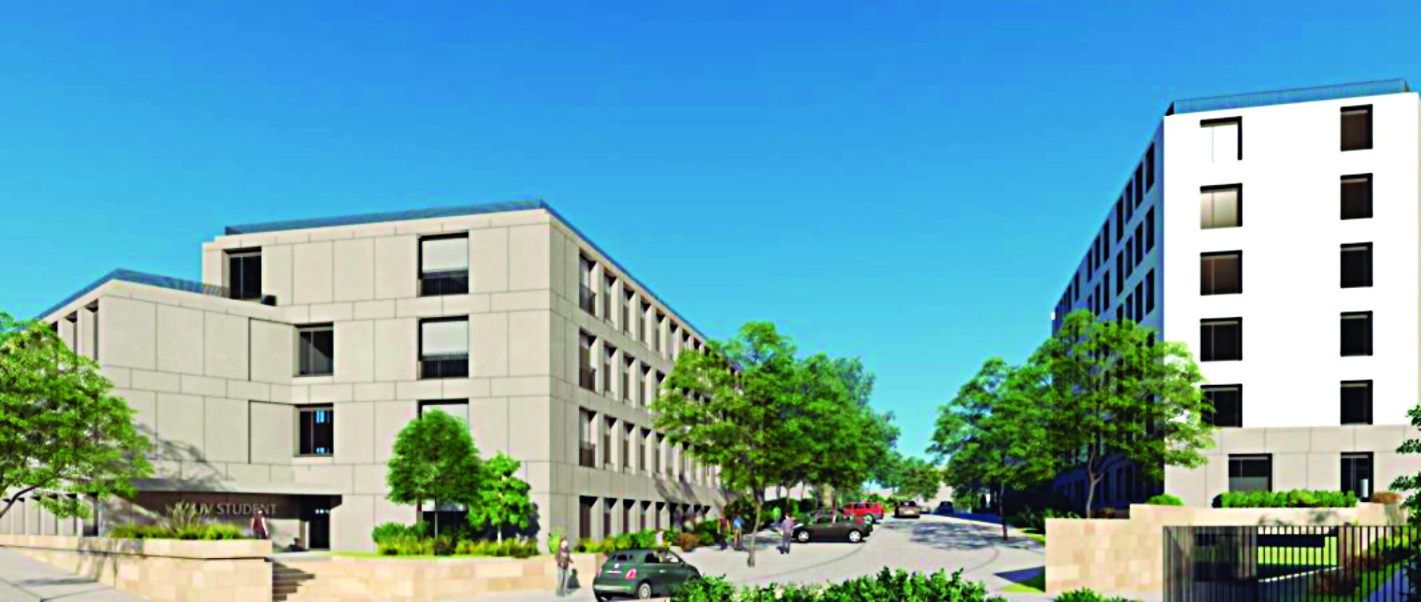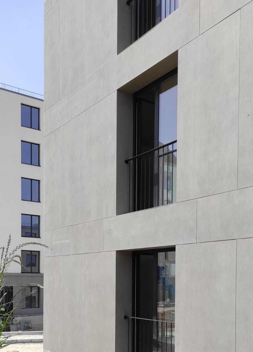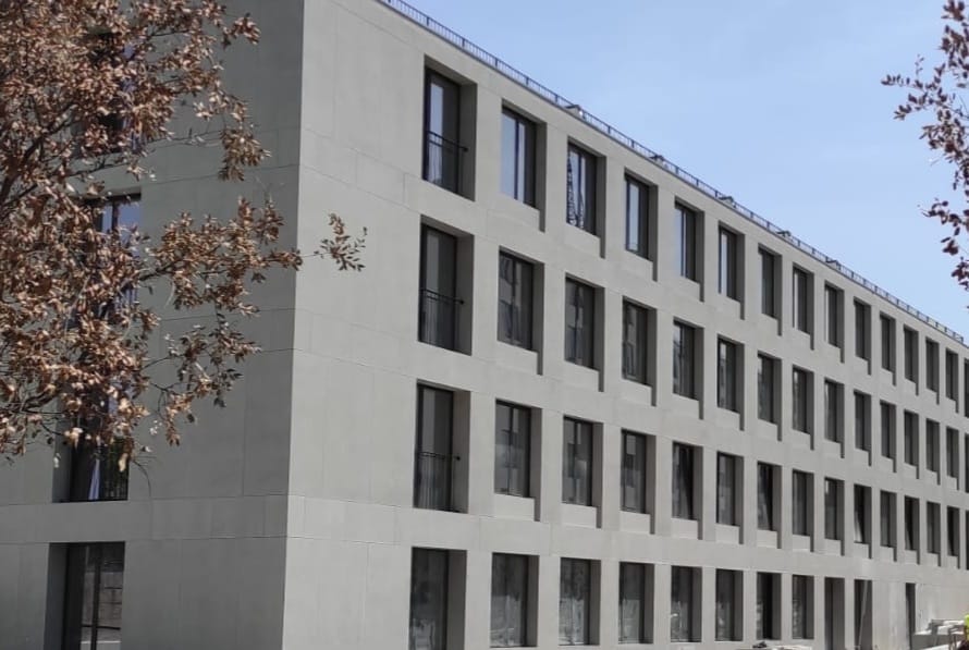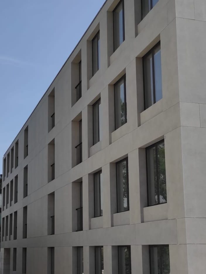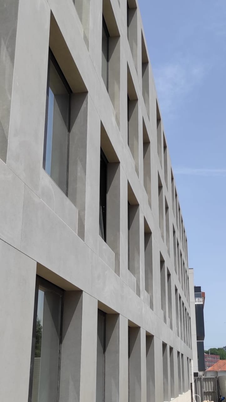 Fachada Ventilada executada com lamina cerâmica e compósito de alumínio com grampo à vista e grampo oculto com 4000 m2 em residência universitária no campus universitário da Asprela composta por três edifícios, em frente ao ISEP (Instituo Superior de Engenharia do Porto), Porto